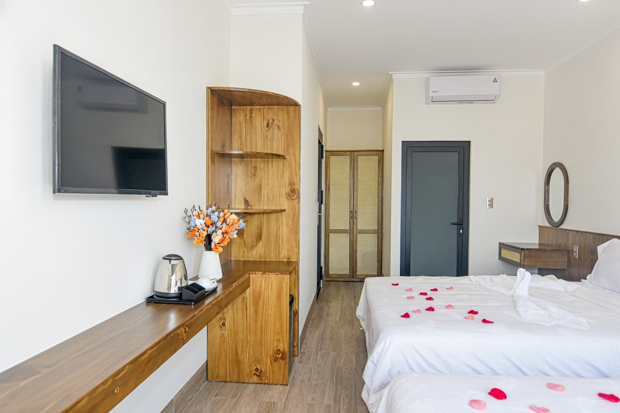 Nội thất trong phòng được chăm chút hài hòa, từ hai giường đôi êm ái đến hệ thống chiếu sáng ấm áp. Màu sắc trang nhã, cửa kính lớn đón gió biển và ánh sáng tự nhiên giúp không gian luôn sáng sủa và dễ chịu. Phòng cũng được trang bị đầy đủ tiện nghi hiện đại: TV màn hình phẳng, tủ lạnh, wifi, cùng hệ thống nước nóng lạnh tiện lợi.