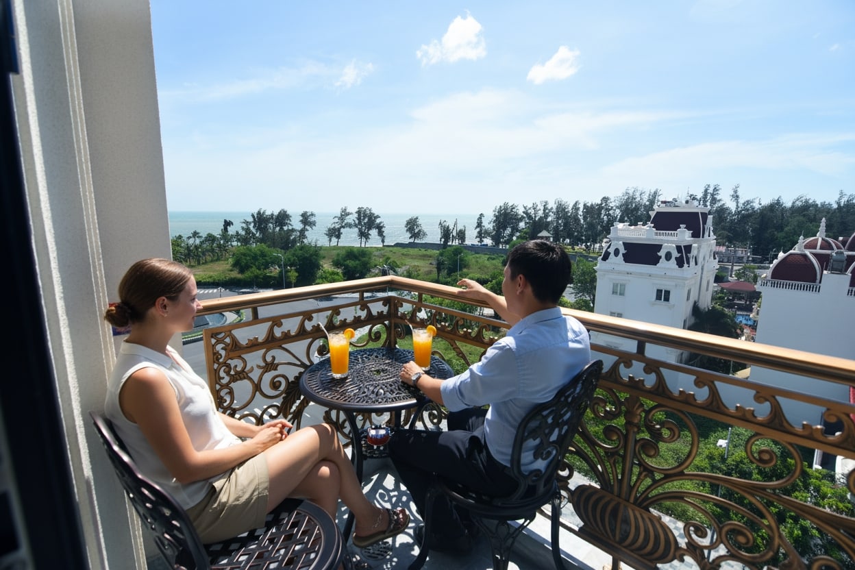 Từ ban công, du khách có thể phóng tầm mắt ra biển xanh mênh mông, tận hưởng những khoảnh khắc thư giãn cùng gia đình như uống trà buổi sáng, ngắm hoàng hôn hay đơn giản chỉ hòa mình vào không khí trong lành của biển cả.